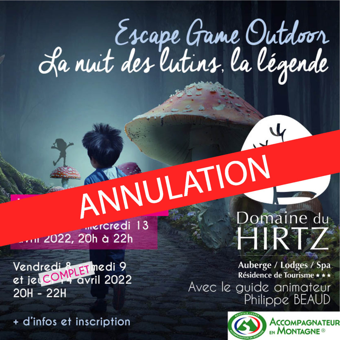A la demande du collectif Biodiversité de Wattwiller pour la protection de la faune et de la flore et afin de permettre le comptage nocturne des animaux dans la forêt proche du Domaine du Hirtz, les sorties Escape Game Outdoor prévues le 8,9,12,13,14 Avril sont annulées.